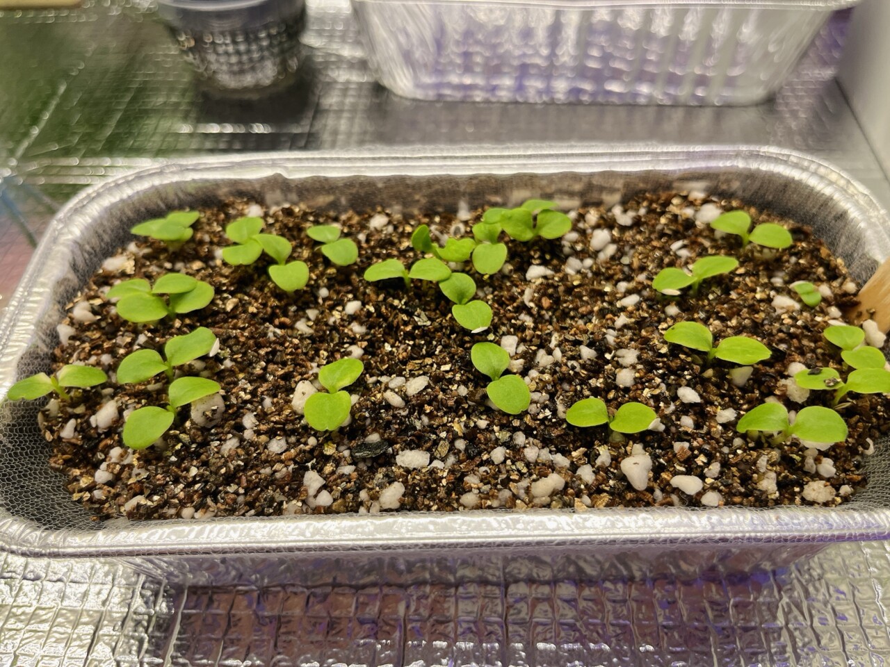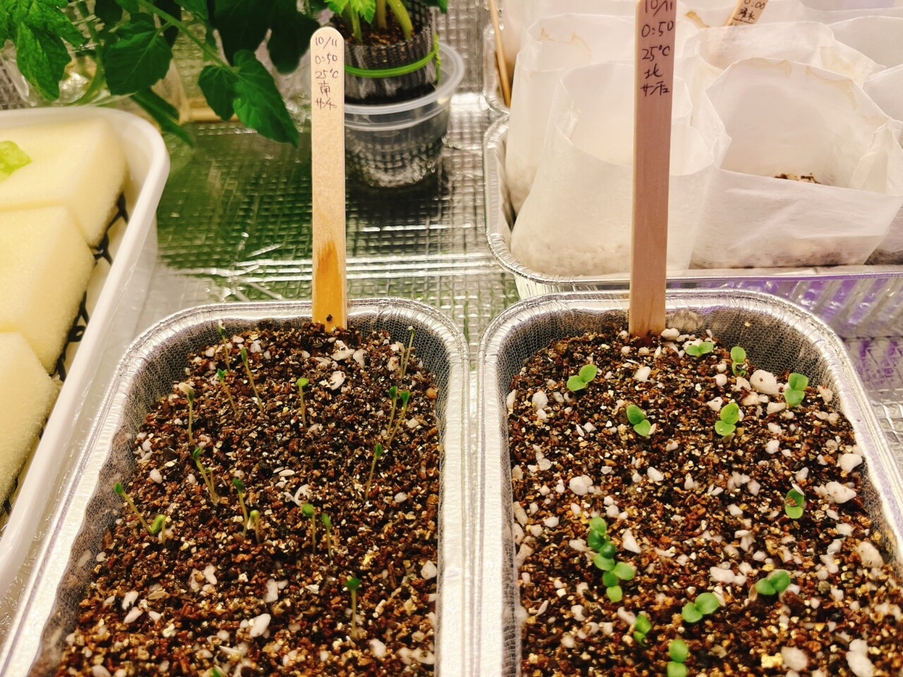 一気に色々植えすぎて栽培用ライトの面積が足りないため、栽培用LEDと普通の電球色LEDで育ち方を比較してみる。