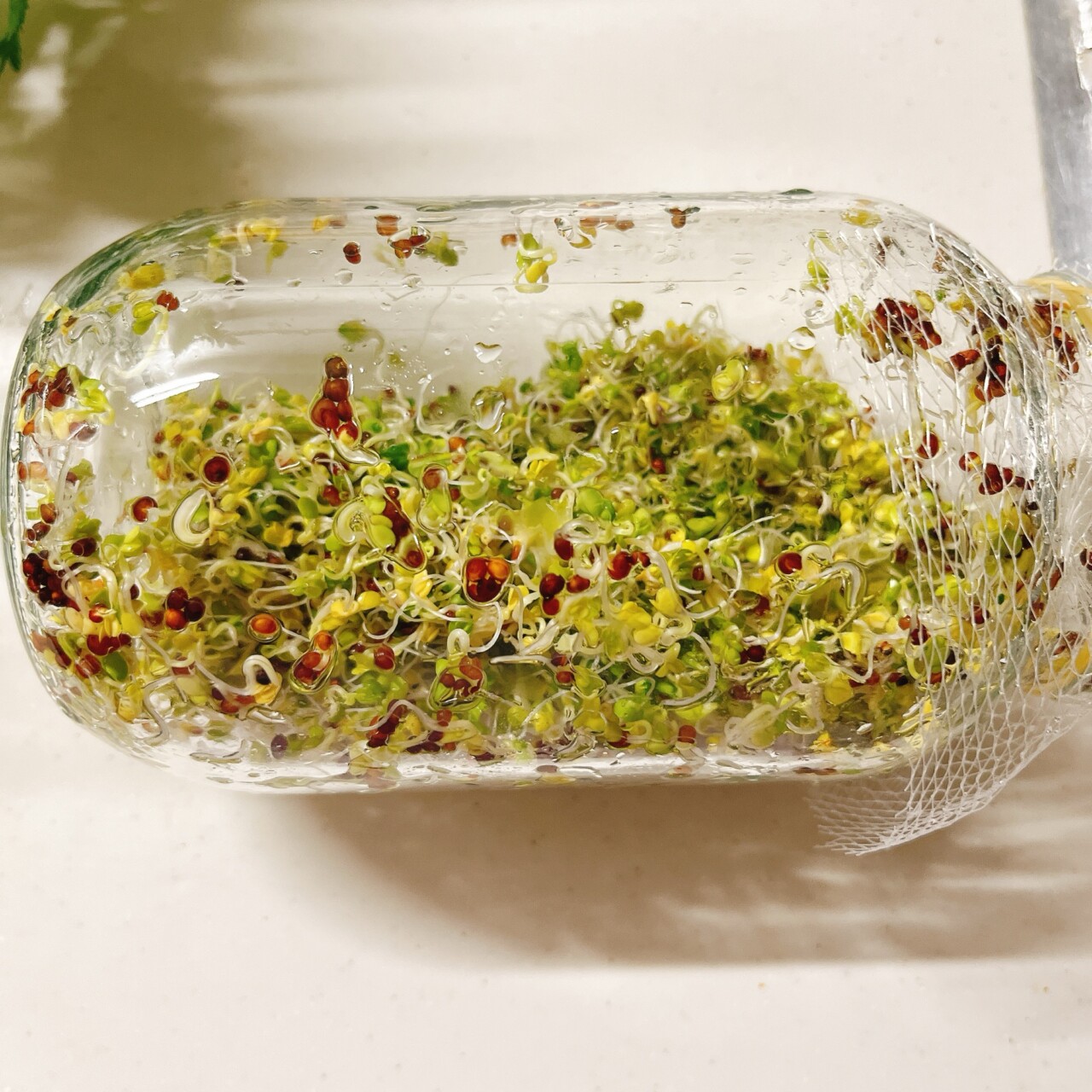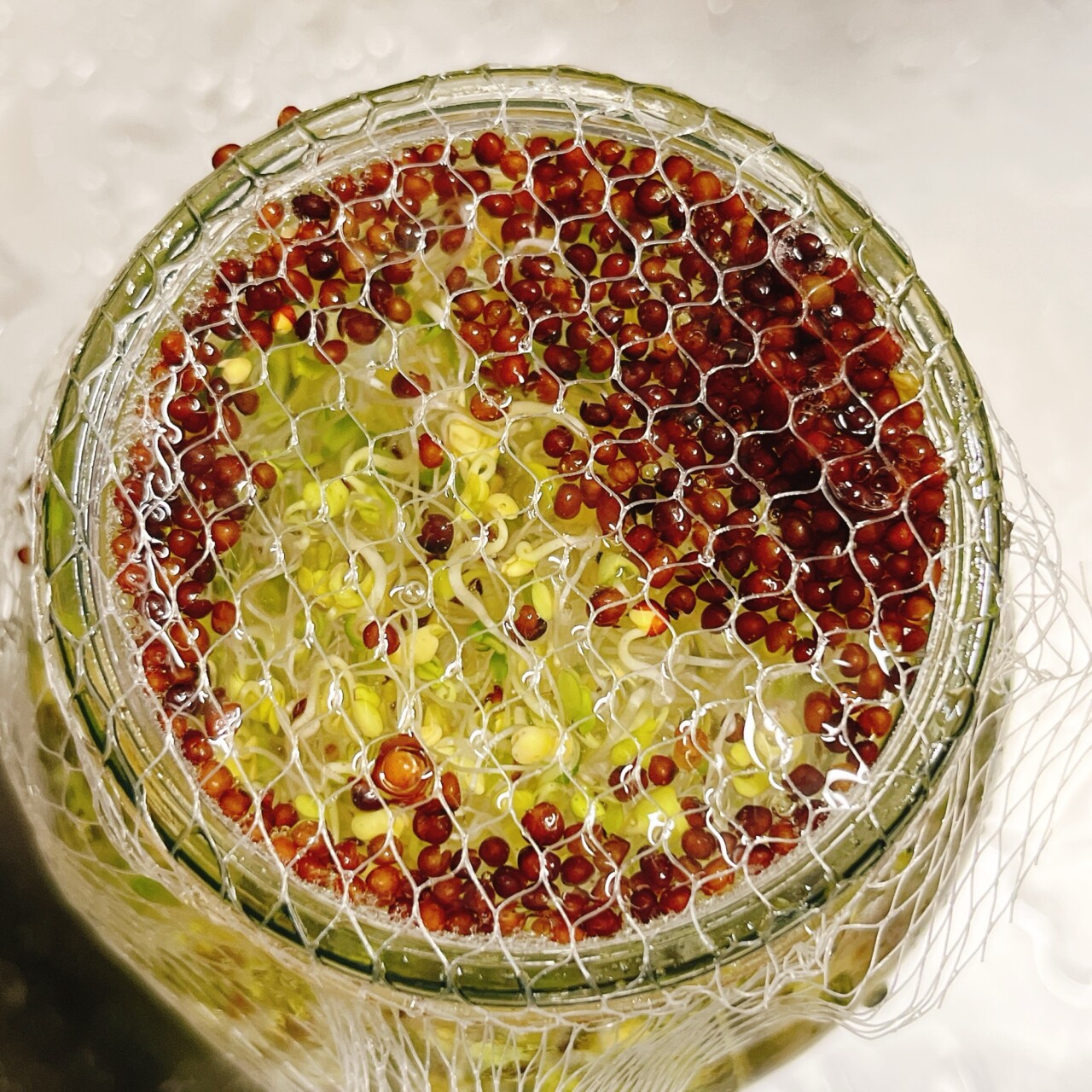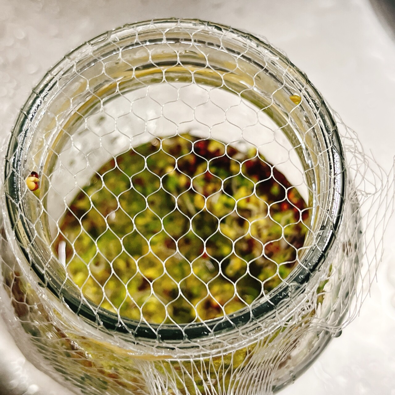 瓶とネットをお湯で消毒し、ブロッコリースプラウトの種を20ml入れてネットを2本の輪ゴムでしっかり留め、二回ほど洗ってから一晩水に浸けておく。