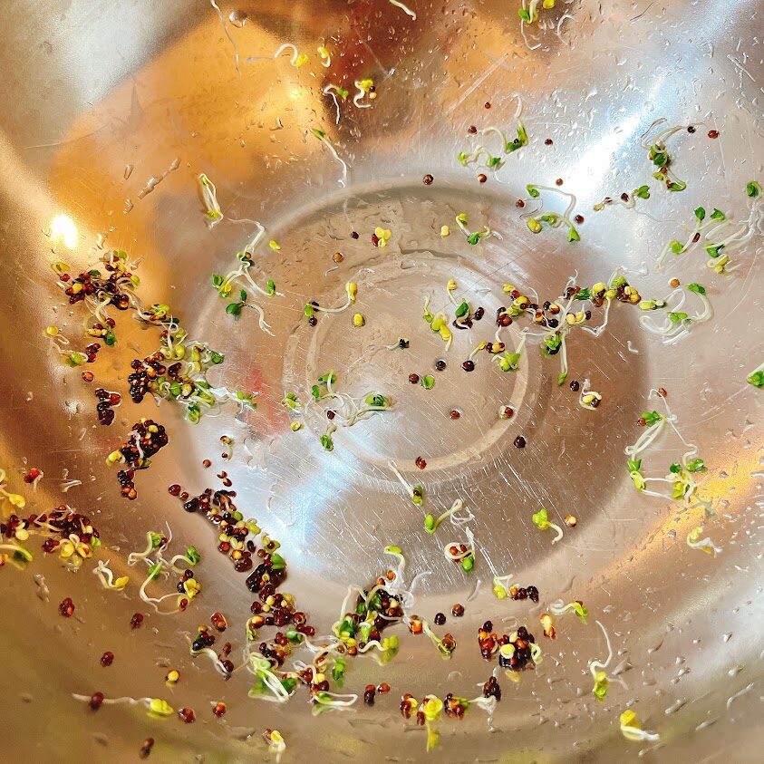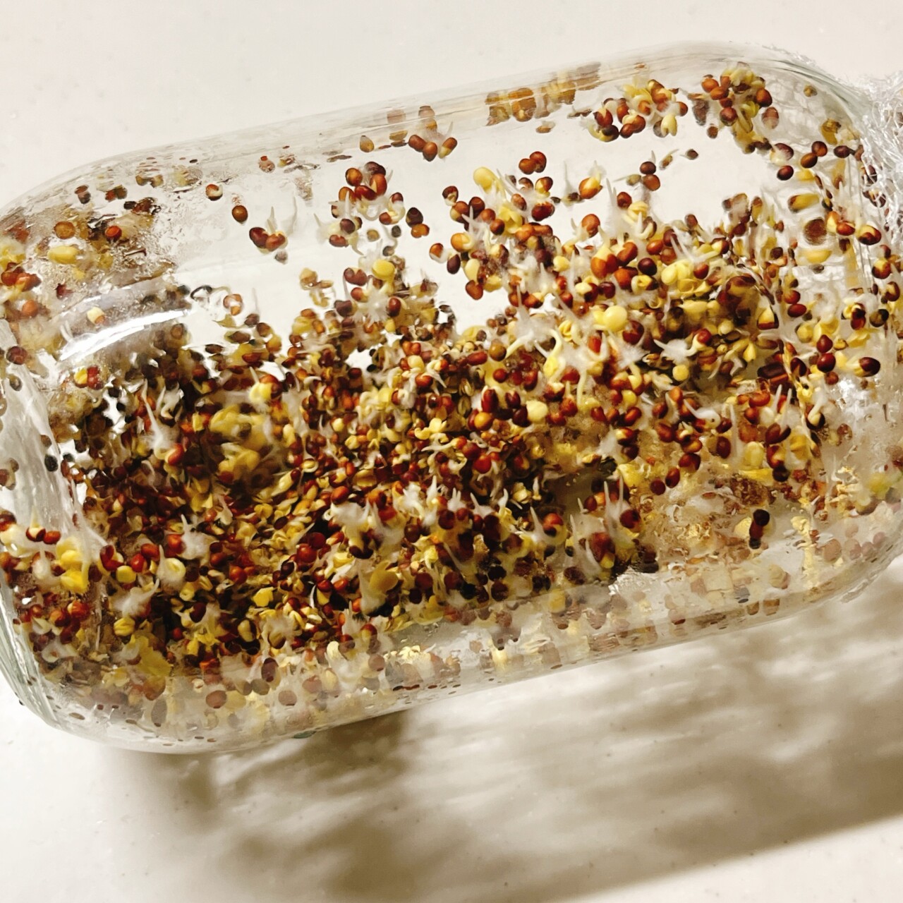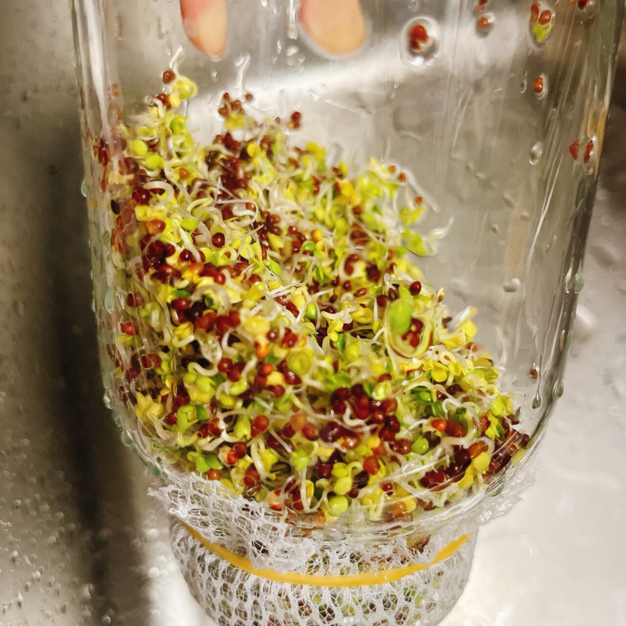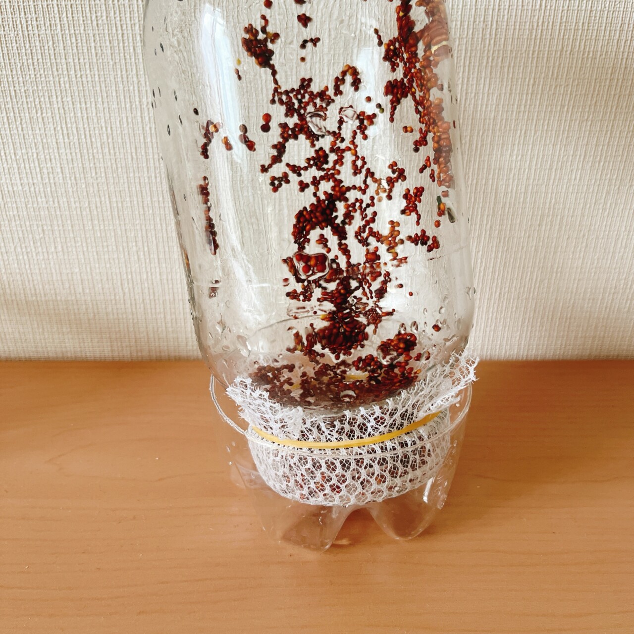 瓶とネットをお湯で消毒し、ブロッコリースプラウトの種を20ml入れてネットを2本の輪ゴムでしっかり留め、二回ほど洗ってから一晩水に浸けておく。