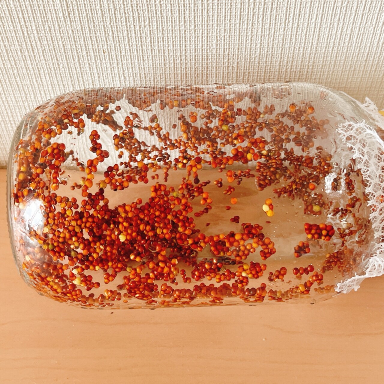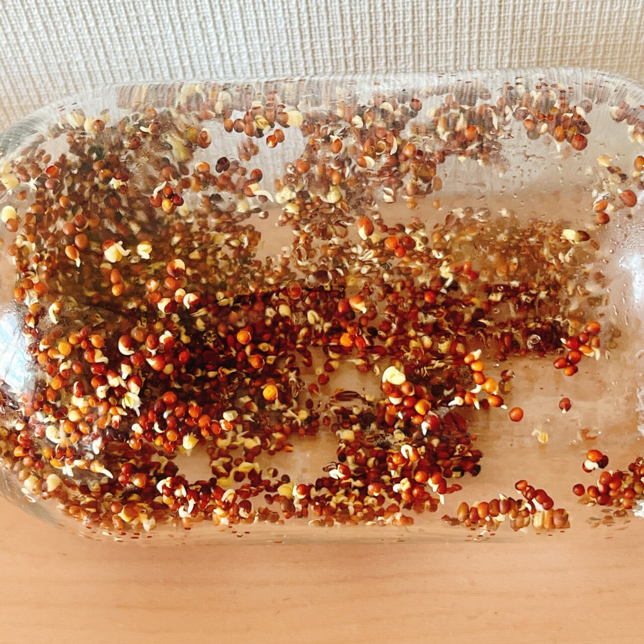 1晩置いたら水を捨てて二回ほど種をすすぎ、ひっくり返してしっかり水を切る。