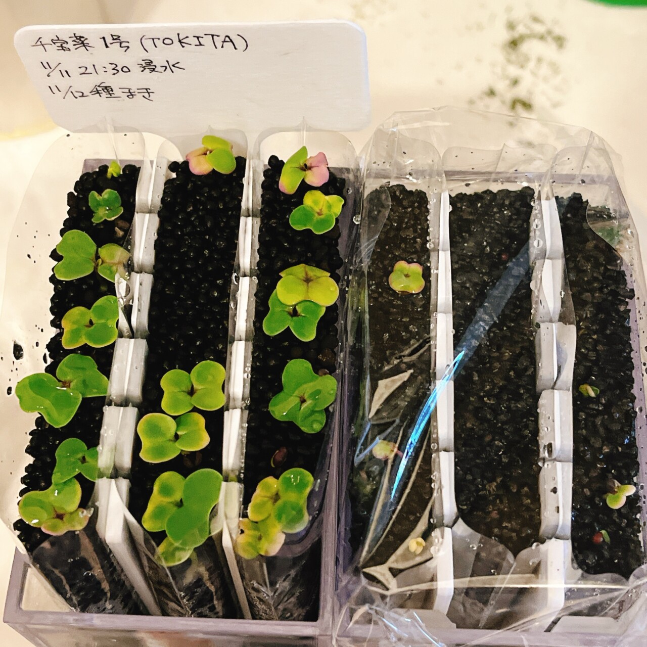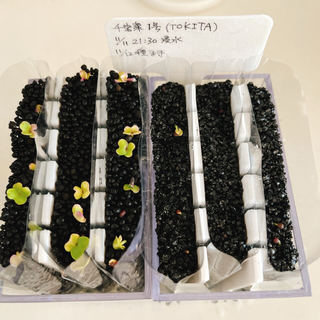 アクリル容器の中で3列にわけて一晩浸水させた種を植え付け。